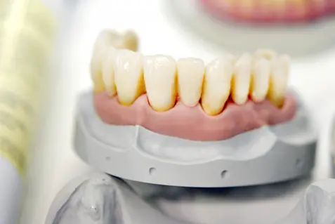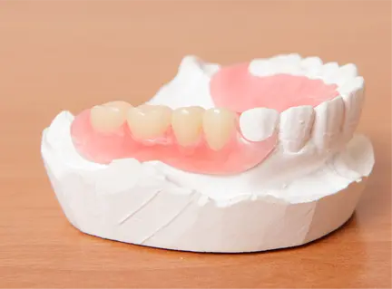 床の部分がプラスチック(レジン)でできた入れ歯であり、保険適用の範囲内で作製することができます。安価でご提供でき、かつ細かな調整を行いやすい特徴を持ちます。一方プラスチック製のため厚みが出てしまい、装着時に違和感が出やすいデメリットもあります。