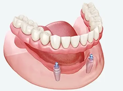 顎骨にインプラント体(人工歯根)を埋め込み、土台として入れ歯を固定します。インプラント体と顎骨が噛み合っているため強い固定が得られ、硬いものでもしっかり噛むことができます。ご自身で自由に取り外しができる点も、インプラントオーバーデンチャーのメリットです。