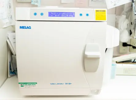 「滅菌・消毒・清潔・綺麗」を医院理念とし、治療に用いる切削器具(⻭を削る道具・タービン・バーなど)や診療器具(根の治療に使用する針・リーマーなど)構造上滅菌が可能なものは患者様毎に滅菌して使用しております。構造上滅菌が不可能なものに関しては、可能な限りディスポーザブル(使い捨て)品を使用し、院内感染の予防に努めておりますので不安なく治療を受けて頂けます。待合室や診療室、消毒室も常に清潔と綺麗を心掛け、患者様に気持ちよく治療を受けて頂けるとともに、スタッフが気持ちよく働ける院内環境を目指しております。