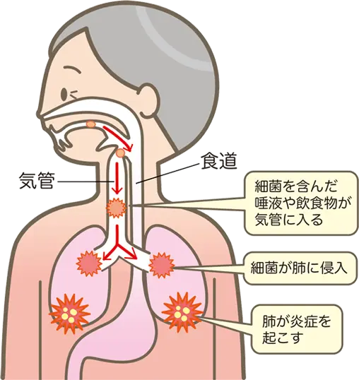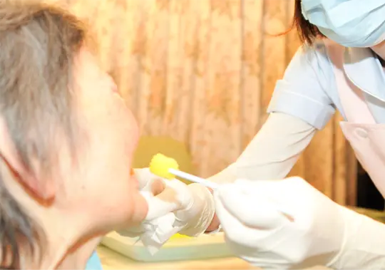 死亡原因として多い「肺炎」もその一つで、肺炎による死亡率は年齢を重ねるほどに増えていきます。口腔内の雑菌を気管に吸い込んで肺炎になるケースや高齢者の場合、食べ物を飲み込む力や噛む力の低下によって誤嚥することで肺炎を起こす「誤嚥性肺炎(ごえんせいはいえん)」のケースもあります。 いずれの場合もしっかりとした口腔ケアや、嚥下のリハビリを行うなどの予防が効果的です。 西岡歯科医院の訪問歯科診療では一般的な歯科治療だけでなく、歯科医師や歯科衛生士による口腔ケアも行なっています
